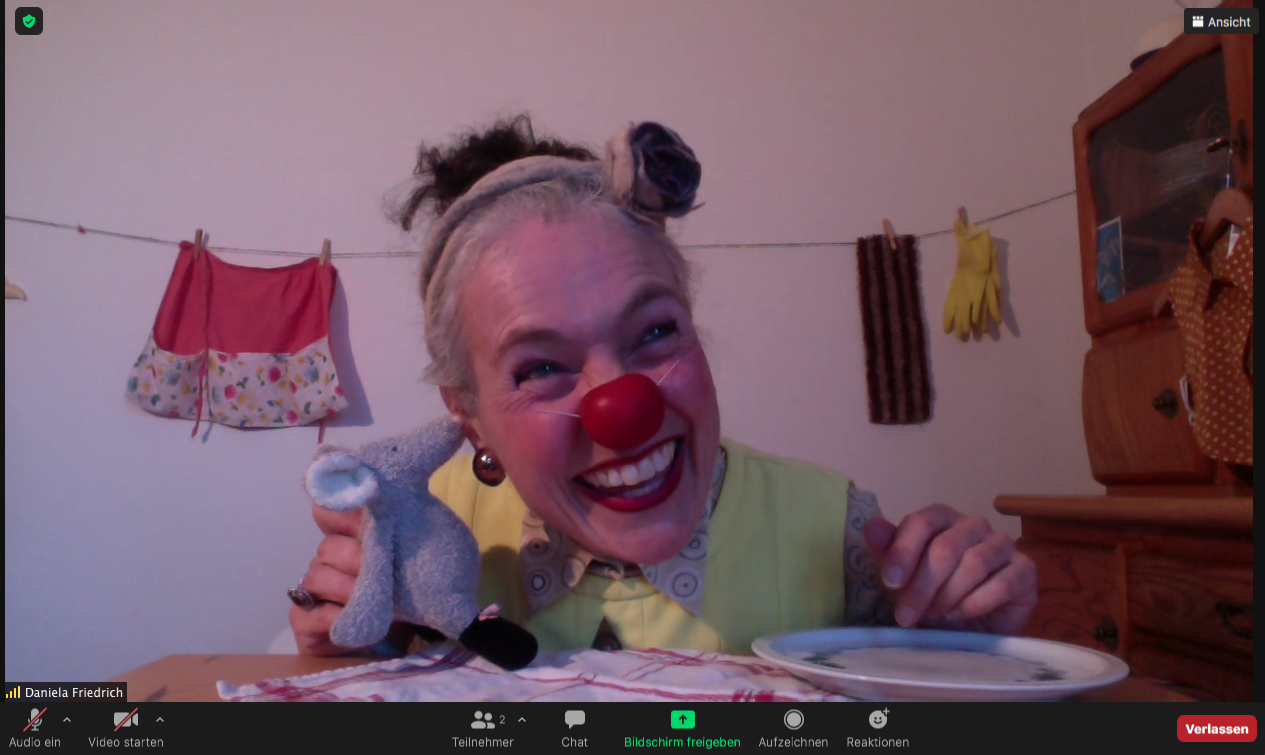 Auch online über den Laptop oder ein Tablet ist ein Clownsbesuch bei Kindern möglich. Fräulein Kunigunde kann live eingeladen werden und es entsteht eine Begegnung von Bildschirm zu Bildschirm.